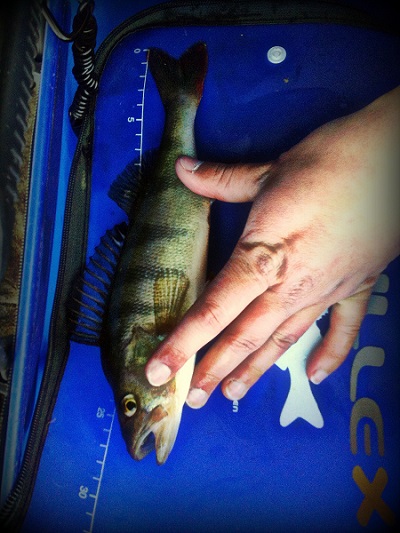 15 min passiert nix, dann gibts nen mittsechziger Hecht-Nachläufer, nen 30er Barschnachläufer, nen Fehlbiss und nen ultraschmalen 27er Barsch, der rein optisch auch nen grüner Minizander hätte sein können :lol: