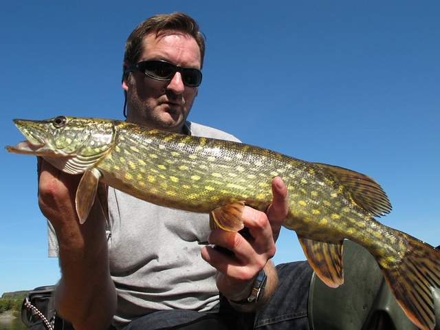 Anderer Köder dachte ich, und siehe da sofort ein heftiger Einsteiger der direkt über die Bremse ging. Oh dachte ich, „dass scheint ja ein richtiger Brummer zu sein“ aber nein, kein Barsch sondern ein Hecht kam zum Vorschein. Nach knackigen kurzem Drill an der feinen Barschrute hatte ich so meinen Spaß.