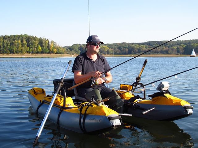 Nach dem ich mein Pontoon Boot aufgebaut hatte und alles soweit startklar war, ging es erstmal Richtung Überlauf um dort den Hechten nach zustellen. Außer einer schönen Aussicht auf den unteren Teil des Sees kam nicht der ersehnte Hecht und nach einer Stunde habe ich es aufgegeben.