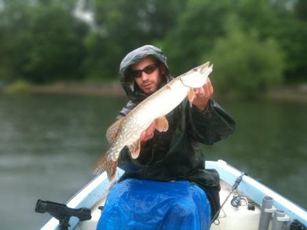 Ich selbst war auch wieder desöfteren unterwegs, Schneidertage gabs zwar keine, aber berauschend war es auch nicht. Am Mittwoch war ich zusammen mit Arne einen Tag lang vom Boot aus unterwegs um mal den Stachelrittern auf den Zahn zu fühlen. Das Wetter war super beschi.... Angefangen zu fischen haben wir um 7.30Uhr und um 17Uhr hat es das erste Mal (!) aufgehört zu regnen :( ziemlich nasse Geschichte. Immerhin haben uns die Barsche nicht ganz im Stich gelassen und so konnten wir immerhin zusammen etwas weniger als 40Barsche und einen Hecht verhaften. Der größte Barsche hatte 38cm, vielleicht 10 Fische waren 30+. Der Hecht hatte satte 80cm und bot ein Tänzchen der allerersten Güteklasse an der