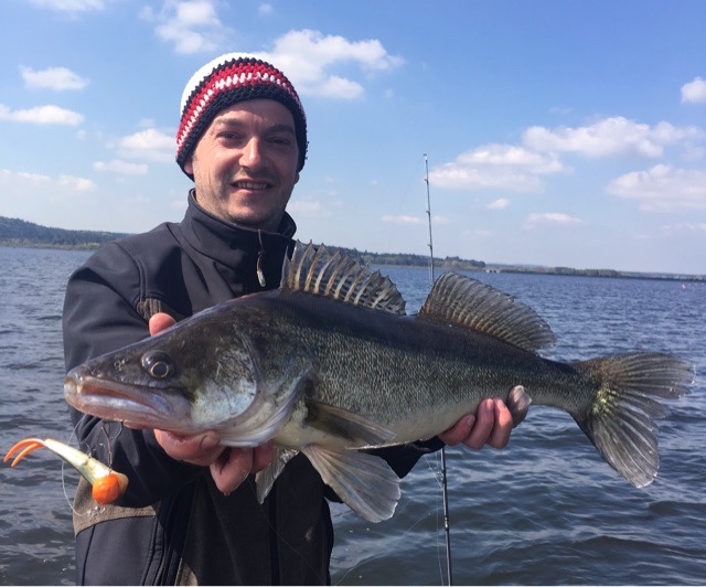 Mal vom Megawind abgesehen ging nicht viel. Nach unzähligen Stunden mit nur kleinen Räubern ging mir am vorletzten Tag dann doch noch der eine Fotofisch an den Haken. Nachdem er im Echo auf 7m in die Anzeige lief kurbelte ich meinen Köder von 10m wie blöd nach oben und ließ ihn etwa 1,5m über den Fisch stehen. Der machte dann die Rakete nach oben und zum Vorschein kam ein wirklich toller Zander. (85)