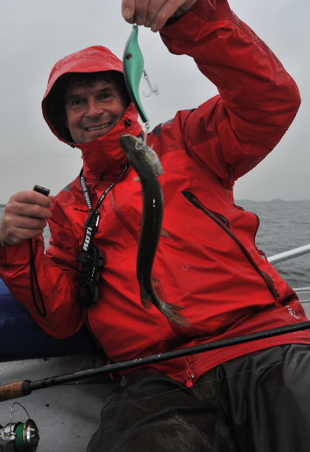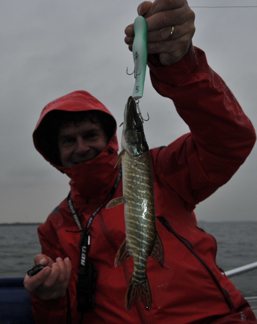 Heute morgen biss dann erst mal wieder nichts. Beißzeit scheint so 8.30 - 9.30 Uhr zu sein. Um 8.45 Uhr gab´s dann auch den ersten Biss. Ein Donnereinschlag auf den 08er-Zalt (d-grün, fluo +weiß). Nach kurzer Gegenwehr in der Tiefe trieb plötzlich ein schöner Hecht an der Oberfläche. Gefääährlich - wenn die nicht mehr schwimmen wollen und einfach liegen bleiben. Regungslos blieb er an der Oberfläche und ich schob mich langsam ran. Als ich ihn packte und hochhob, "explodierte" der ca. 95er Hecht doch noch und fiel wieder ins Wasser - ohne Foto ist er dann doch entkommen.