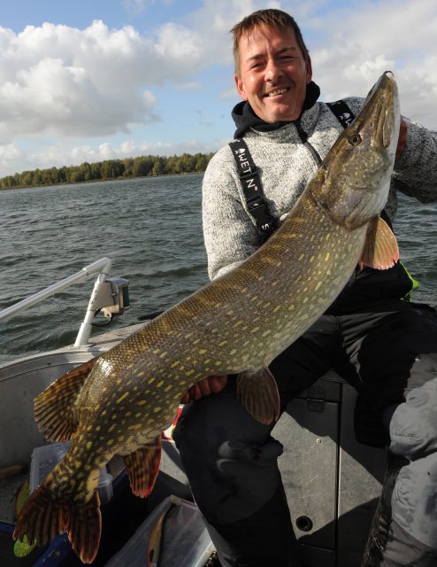 in diesem Herbst war ich auch in NL zum Angeln. Zunächst ging es wie gewohnt mit dem B1 an den Start und der fing auch recht ordentlich. Dann fiel mir aber ein, dass ich auch einen Prototypen des neuen B3 (natürlich auch in UBS-Farbe...) dabei hatte. Der wurde dann endlich mal montiert und ausprobiert. Hammer, was dann passierte, denn die Bissfrequenz ging deutlich hoch. "Ob die Räuber im Herbst doch lieber groß mögen?" Ganz offensichtlich, denn nach etlichen Fischen mehr stieg zuletzt auch noch ein Urvieh mit 1,28 m und 17 Kg Gewicht ein. Die Panik meiner Gäste im Boot war groß, denn ich besaß den einzigen B3, erst Recht in dieser Farbe! Ruhe kehrte erst wieder ein, als ich den Köder durch Vorfachbruch ca. 30. Minuten nach dem Fang des Riesenhechtes verlor. (eigentlich ist das kein Problem, denn der B3 schwimmt ja!). Just in dem Moment, als ich den Köder wieder einsammeln wollte, hakte einer meiner Gäste aber auch einen Superhecht (1,19 m!) und wir konnten nicht auf Suchfahrt gehen. So ist das Schicksal manchmal... ;-)