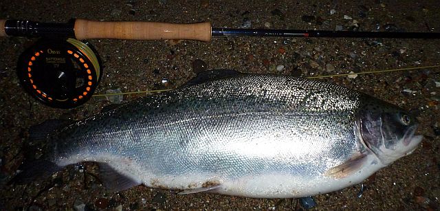 Anbei ein Bild von 3 ausgebüxten Regenbogenforellen, die ich Mitte Oktober fing, also 3 von den 80.000 die ausgebüxt sind, die übrigens garnicht so einfach zu fangen sind, denn sie wurden ihr Leben lang mit Perllets gefüttert. Man kann sie in den ersten Wochen nur sehr schwer fangen, da sie das Futter im Meer nicht kennen. Fing die 3 mit einer Fliege, die Perllets ähnlich sehen. Wissenschaftler haben festgestellt, das ein Teil (ca. 10%) der ausgebüxten Forellen ganz einfach verhungern werden, weil sie nie jagen gelernt haben.