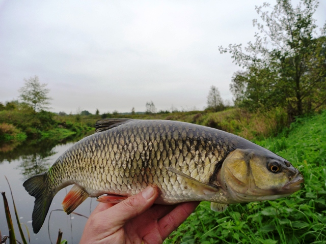 Diese Stelle befische ich sehr gern, weil es in diesem kleinem Fluss echt voll Spaß macht zu angeln. Der Fluss ist an dieser Stelle max. 1m tief. Meist gibt es hier eine sehr kurzweilige Angelei. Heute auch??? Dort angekommen musste ich erstmal feststellen, dass die Trübung des Wassers sehr mager ist. Fast glasklar präsentierte sich der kleine Wiesenfluss. Also erstmal unter die Kanalbrücke. Hier ist es sehr dunkel und man kann immer mit dem einen oder anderen Barsch rechnen. Los geht’s – kleinen Original im Barschdesign dran und ab dafür. Nach wenigen Minuten kam schon der Erste Barsch. Ein stattlicher Kollege von ca. 20cm. Für den Bach schon ganz ok. Direkt danach konnte ich noch 2 St. Erwischen und hatte noch 3 Fehlbisse. Geht doch! Dann kam noch ein kleiner Hecht ans Tageslicht. Am Ende des Tunnels schiebt sich dann eine Mauer noch ca. 15m in den Fluss. Sie dient als Stütze für die Brücke! Dort wo das Wasser bricht, hat man immer gute Chancen auf den König des Wiesenflusses – Der Döbel! Geliebt und gehasst – er ist sehr scheu und bei diesem klaren Wasser ist höchste Konzentration angesagt. Das Oberste Gebot lautet °“RUHE“! Bei genauer Beobachtung der Wasseroberfläche kann man meist schon die Ersten Anzeichen auf eine Döbel-Gruppe erkennen. Kleine Kringel an der Oberfläche, oder eine Welle die sich durch den Fluss bahnt – da stehen Döbel. Ich pirsche mich ganz ruhig an die Stelle – verharre dann bewegungslos und versuche mich nicht viel zu bewegen. Der Köder muss genau an die Stelle – da wo die Döbel vermutet werden. Los geht’s – The splendid Shot! Es muss ein perfekter Wurf sein – Köder fliegt – passt! Der kleine Original liegt auf der Wasseroberfläche – jetzt nichts machen! (Ganz wichtig!) Passiert nach 5-10 Sekunden nichts – Rute auf 9:37h und dann kommt die Topwater-Beetle-Dance Methode. Dabei versuche ich den Köder wie ein Käfer auf der Oberfläche tanzen zulassen. Gesagt – getan! Welle kommt vom Brückenpfeiler – Explosion an der Oberfläche – Rute geht in Lichtgeschwindigkeit auf die 12:23h Position – Hängt! Geile Kämpfer diese Döbel – weiter geht’s. Das Größte Problem ist immer nach einem Fang. Durch den Drill sind die anderen Schisser meist sofort weg. Jetzt kann man getrost ein paar Meter weiter gehen. 20m weiter – nächste Welle gesichtet – Splendid Shot – Original liegt verführerisch auf der Oberfläche. Let`s Dance – Dicke Bugwelle kommt vom Ufer – Attacke! Mist – Biss voll verkloppt! Nach 2 weiteren Fehlattacken scheint endlich wieder die Sonne – Haiflosse kommt frontal – WOSCH – Fisch hängt! Hammerdrill an feinem Gerät – 45cm Döbel Power – Geil! Und weiter – keine 10min. – KAWUSCH – Schöne Döbel-Mutti inhaliert sich mal wieder das Objekt der Begierde weg – Den Original! 41cm – macht das Laune. Danach wird der Fluss blitzartig schnell. Irgendwo ist eine Schleuse geöffnet. Ich gehe zurück in den Tunnel und dort wo ich die drei Barsche gefangen hatte, knallte es jetzt richtig. Jeder Wurf ein Biss. In sehr kurzer Zeit fange ich noch ca. 10 Barsche – in der schnellen Strömung echt ein Riesen Spaß.
