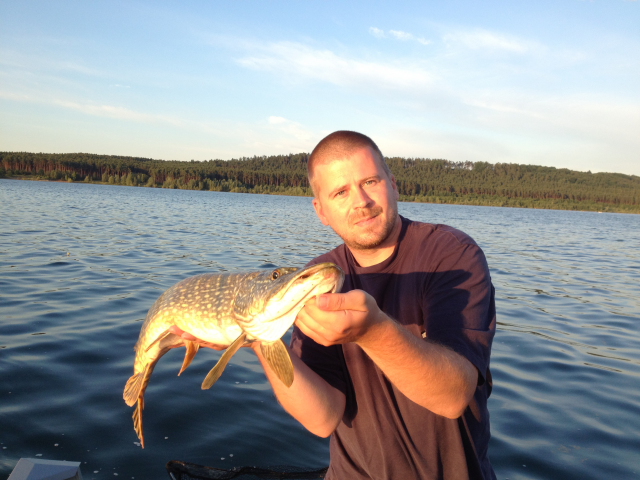 Anfangs gingen in kurzer Zeit mehrere kleinere Hechte an den Haken, doch dann wurde es zäh. Andi vermeldete derweil von der anderen Seite des Sees Erfolg und wir machten uns ebenfalls in diese Richtung auf. Unser Kollege konnte schleppender Weise mehrere Fische darunter zwei schöne Zander (70+78) landen, während bei uns lediglich noch ein Hecht beim Werfen überlistet wurde. Dann machte uns das Wetter einen Strich durch die Rechnung. Die Wolken hatten sich verzogen und die Sonne verwandelte meine Kniescheiben in glühende Mini-Herdplatten.