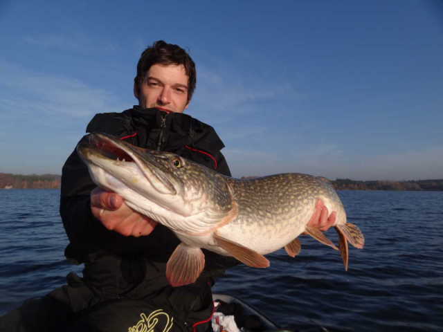 Gut dass es den Wirt zum Signal gibt, die Info-Tauschbörse überhaupt! Nach einigen anregenden Gesprächen gings am nächsten Tag zum benachbarten Kleinen Brombach! Das Wetter ein wahrer Traum und nach kurzer Zeit der erste Fisch. Guter Start :) Spätestens als Steff während der Brotzeit mit vollem Mund dem Nachbarboot den laufenden Drill seines 1,05er Hechts erklärte, war der zähe Vortag vergessen. Kurze Zeit verging als mir ein Stachelritter dann fast die Rute aus der Hand riss, was die Laune weiter steigen ließ! :D Noch begeistert meine Montage richtend funzte Steff dann noch nen Metrigen aus dem Wasser. :shock: