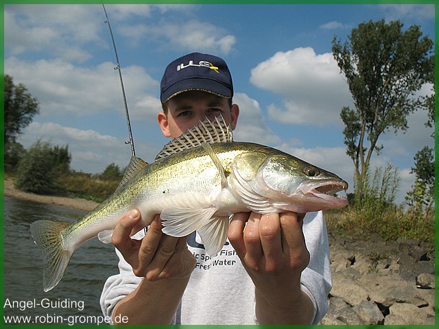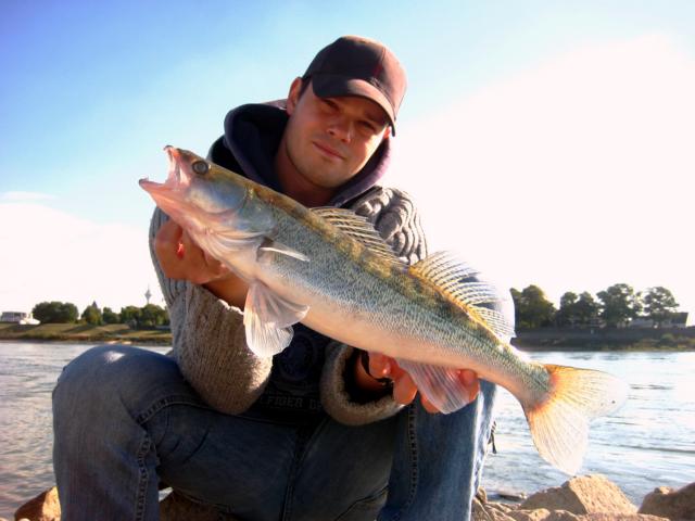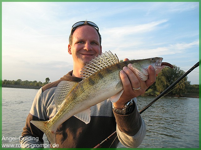 Früh morgens traf ich mich mit Jens und Olaf zum Zanderfischen am Rhein. Beide waren bereits erfahrene Zanderangler, jedoch wollten beide neue Techniken erlernen und „neue Ufer“ entdecken. An den ersten Spots, wo wir in den letzten Touren recht gut gefangen hatten gab es keinen Zander. Ich war nach wenigen Minuten beunruhig, da dies Top Ecken für Zander sind! Doch kurze Zeit später sah ich im rechten Augenwinkel wie Olaf einen harten Anhieb setzte. Sofort sah man, dass ein ordentlicher Fisch am anderen Ende der Schnur hängen musste da sich die Rute nach dem Anhieb deutlich krümmte. Olaf kurbelte wenige Zentimeter der Schnur ein, als wenn ein D-Zug eingestiegen ist schnellte die Rute aus der vertikalen in die horizontale in Richtung Wasseroberfläche runter. Das 0,38er Vorfach hatte keine Chance, vermutlich sprengte dies ein ordentlicher Waller. Dennoch fischte Olaf mit vollem Elan weiter. Im weiteren Tagesverlauf gegen Mittag wurden die Fische dann bissig. Olaf konnte direkt einen Zander und einen tollen Barsch mit dem C-Rig auf einen Keitech Fat Swing Impact landen während Jens und ich noch Schneider blieben. Eine Buhne weiter durfte ich dann auch zwei Zander landen. Ebenfalls gebissen auf das C-Rig mit Schlüpferfarbigen Swing Impact´s. Während einer längeren „Durststrecke“ gab es hin und wieder ein paar bisse. Gegen späten Nachmittag konnte Olaf seinen zweiten Zander mit dem C-Rig und einem Rot/Braunen Gummiwürstchen fangen. Olaf durfte sich noch über eine am Wasser liegen gebliebene Tacklebox erfreuen. Schön gefüllt mit Gummifischen + Jighaken. Jens blieb neben einigen Fehlbissen leider „Schneider“, wahrscheinlich wird er auf seiner nächsten Angeltour ordentlich belohnt dafür. Zusammen gab es in 10 Stunden Zanderangeln 4 Zander, einen Barsch, einen Wallerkontakt und ca.6 Fehlbisse.