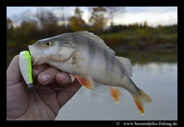 Gebissen hat er auf einen Kopyto Motoroil. Der ca. 22cm Barsch auf einen festen Slottie Perl Weiß/Grün.