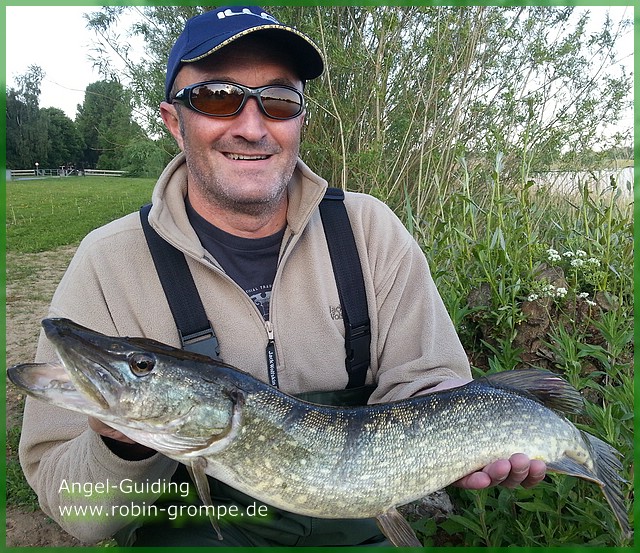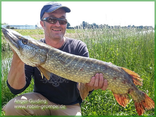 Eine halbe Stunde später setzte er noch ein drauf. Ein auf Sicht angeworfener Meterfisch drehte sich zu seinem Köder und packte zu. Bääääääms.....----Unglaublich!! Sein zweiter Hecht mit 1,09m Länge!!! :o