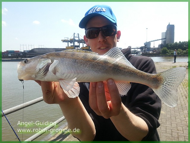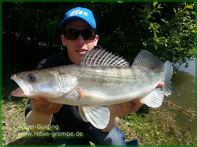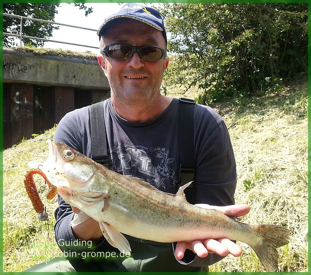 Weiter ging es an ein Fluß und wir suchten im ruhigen Bereich die Zettis. Auch dies dauerte keine fünf Minuten, da hing schon der erste. Auch dort fing Christian seine ersten beiden Zander auf Gummifisch!