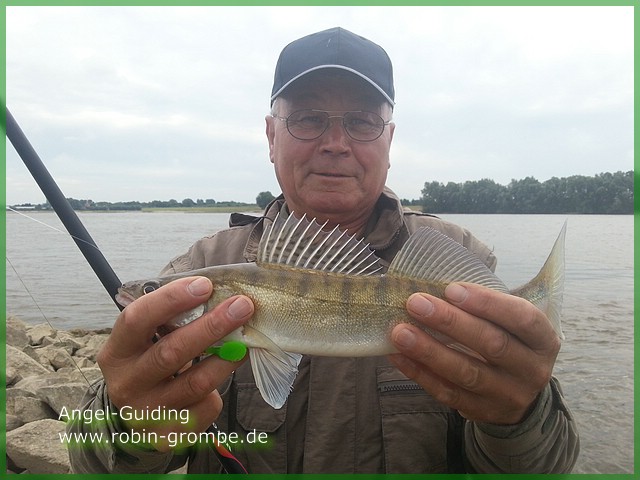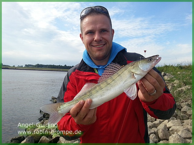 Bei doch aushaltbaren Temperaturen konnten wir wieder einmal echt zuschlagen. Über den Tag verteilt vergnügten wir uns mit 14 Zander und einem Hecht. Richtig gerockt hat das Carolina Rig, bestückt mit braunen Bass Assassin Sea Shads. Benny hat morgens früh aber auch gut mit einem grünen Gambit Shad zugeschlagen. Beide Männer konnten Ihre ersten "Gummi-Zander" verhaften und ich glaube es hat beiden jede Menge Spaß gemacht!