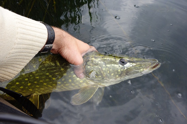 Meine Swimbaits, Wobbler und Gummis habe ich natürlich auch im Regen gewissenhaft weiter geführt, ohne zählbaren Erfolg, nur die, nachwievor laichverrückten, Brassen befreien mich von Zeit zu Zeit aus der Lethargie. Das Regenwasser macht sich nun langsam auf den Weg vom Kopf über den Nacken und Rücken in die Wathose, was für ein tolles Gefühl und ich bin kurz davor mich von Petrus zur Aufgabe zwingen zu lassen, als es in einem Spin-stop einen richtigen Einschlag gibt. Schöner Drill und kurze Zeit später ist ein guter Hecht bezwungen. OK dann bleib ich halt noch ein wenig. Und das soll sich auch richtig lohnen, denn innerhalb von 20 Minuten auf einem vllt. 10*10 Meter Areal können 4 weitere Hechte mittlerer Größe gefangen werden, jetzt bin ich trotz allem tatsächlich bei 7 Hechten gesamt, alles irgendwie komisch.