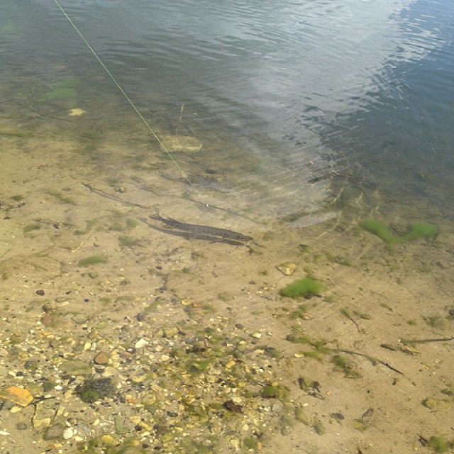 Also auf geht’s, Belly Boat gewässert, Spot angesteuert, Hecht muss her. Drei Würfe, Tock, da hängt auch schon Nummer eins und der kämpft doch schon ganz gut für seine 60cm, warmes Wasser hat auch seine Vorteile. Dann passiert, natürlich, erst einmal eine Stunde nichts mehr. Zu allem Überfluss schläft der Wind auch noch komplett ein und ich angeln in klarem Wasser ohne Welle – das kann ja nix werden denke ich mir noch und Zack, plötzlich hängt Nummer Zwei, wohl der Bruder von Nummer eins…