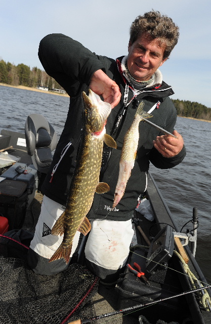 Die Ermittlung von Maulbreiten ist leider selten präzise möglich, da die Bissabdrücke selten genau erkennbar sind. Passend zur Story habe ich aber gerade ein Bild aus Schweden mitgebracht, dass den Kannibalismus der Hechte untereinander gut belegt. Der schon leicht angedaute Hecht steckte im Rachen des gefangenen Hechtes! Der fressende Hecht war allerdings deutlich kleiner... ;)