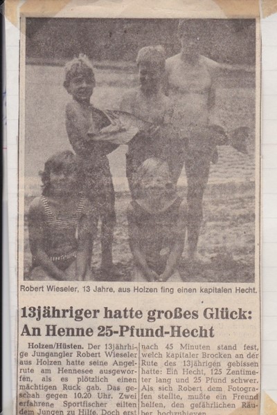 An Christi Himmelfahrt 1976 fing ich meinen ersten Hecht. Er war 72 cm lang und 5 Pfd. Schwer, und er machte mich mächtig stolz. Den hatte ich mich gar nicht getraut zu drillen weil ich Angst hatte es könnte etwas schief gehen. Also drillte mein Onkel Hans , von dem später noch die Rede sein wird . Nach 3 Jahren angeln endlich der erste Hecht , ich war 13 Jahre alt. Es muss aber dazu bemerkt werden , wir gingen nur 4 - 5 Mal im Jahr angeln. Viel zu wenig und ich fühlte mich ständig unterangelt. Aber , wir fuhren damals noch zum campen an den Diemelsee , da konnte man dann 1 Woche angeln. Die Beute war natürlich Rotaugen und kleine Barsche. Halt was auf selbst gesuchte Rotwürmer aus Wessel`s Misthaufen und den auf nächtlicher Tauwurmsuche im Regen gefangenen Tauwürmern so biß.