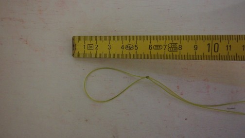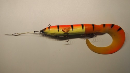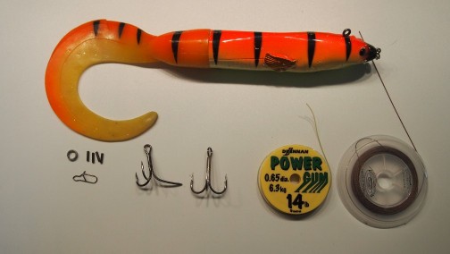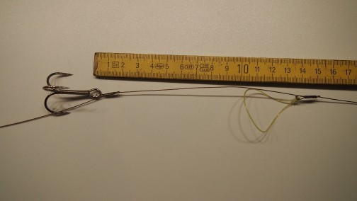 Für diejenigen die es mal testen wollen hier eine kleine Bastelanleitung.Alles was benötigt wird ist Stahl- oder Titanvorfachmaterial,Klemmhülsen,Powergum,evtl. Kleine O-Ringe und einen Einhänger von 2 cm.Bei der Titanverarbeitung noch Schrumpfschlauch mit 1 und 1,5 mm Innendurchmesser.Aus dem Powergum knotet man eine Schlaufe von 6 cm.Diese Schlaufe fädelt man in die Öse die entsteht wenn man das Vorfach dreimal durch die Klemmhülse fädelt.Den vorderen Drilling befestigt man in 14 cm Abstand von der Gummizugöse in der Öse die wieder beim dreimaligem durch fädeln entsteht.Dann formt man nur noch eine Öse für den hinteren Drilling der sich in der hinteren Hälfte des Köders befinden sollte.Jetzt die Länge des Vorfach festlegen und eine Einhängeöse formen, und das war es schon.Der Gummizug kann direkt mit einer Klemmhülse auf Vorfach geklemmt werden, oder wie beschrieben in der Öse befestigt werden,was den Vorteil hat das bei Beschädigung des Gummis durch Zahnkontakt Dieser gewechselt werden kann.Nur noch eine Spitze der Drillinge um etwas mehr als 90 Grad umbiegen,damit sie sich beim Anbiss aus dem Köder lösen können.Ganz wichtig ist ein Springring durch den das Vorfach geführt wird der am Befestigungspunkt zum Köder angebracht wird,sonst ist bei gekappten Gummizug der Köder weg!