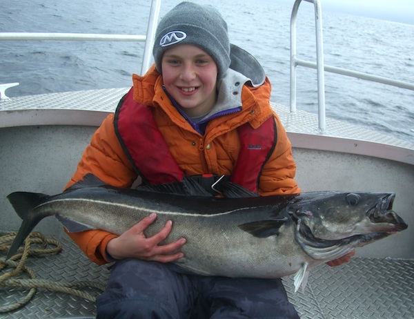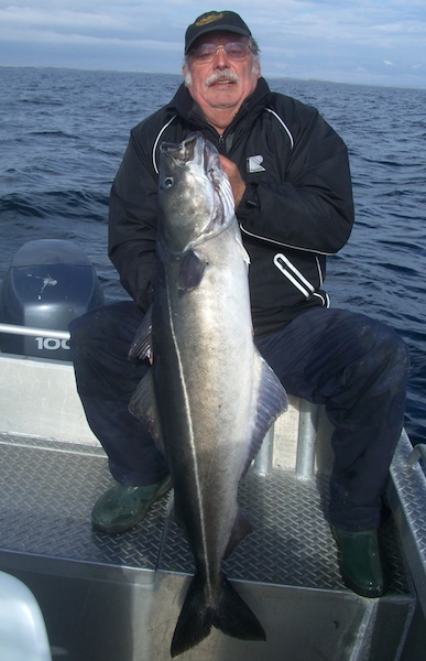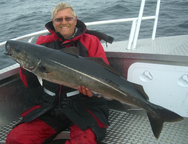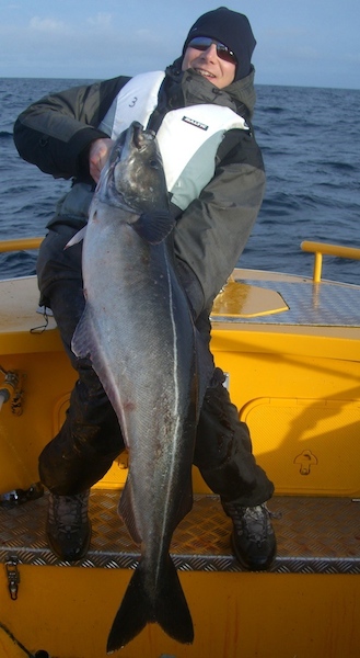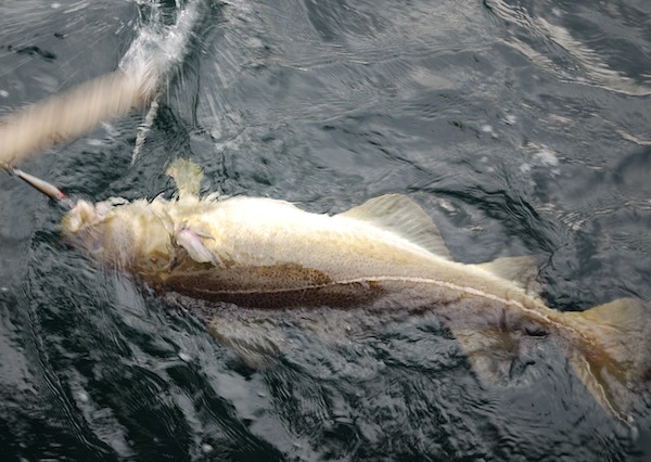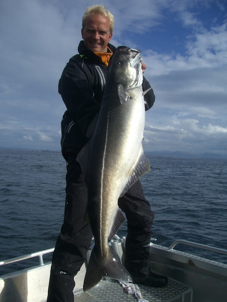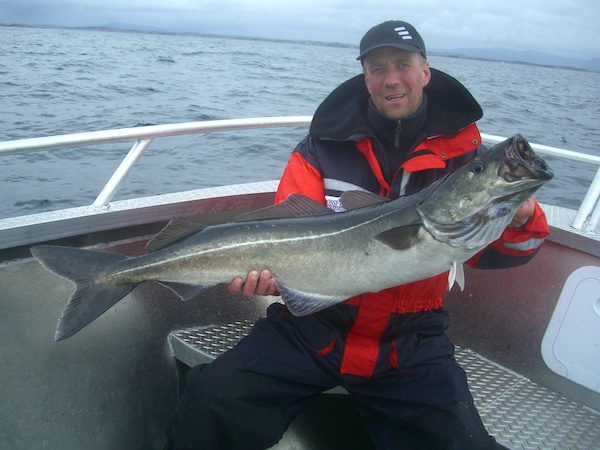 hier ein Seelachsschwarm auf dem Echolot und im Boot