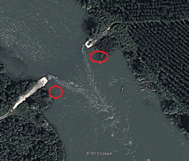 2: Im Bild habe ich eine typische Situation dieses Altarmsystems dargestellt. In den roten Bereichen kamen die Attacken ca. im 2 Min. Takt. Wieder blieb der Fangerfolg aus, da ich anscheinend für die Strömmung die falschen Köder hatte. Welche Köder sind hierfür geeignet?