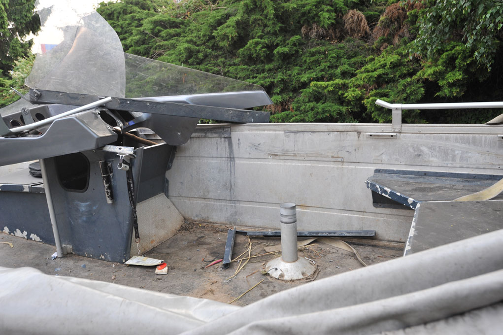 Michael / Holger: Das Boot ist ziemlich gleich geblieben - wieder ein Buster XXL! Diesmal aber mit 2. Stand links. Es waren wohl doch Angler, denn alle Kisten mit Ködern und die Vielzahl der Köder auf dem Boden ging auch mit. Das Boot war insgesamt schon bis auf eine Handvoll Köder ausgeräumt... :evil:
