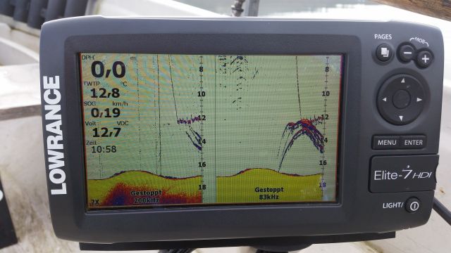 Mit meinen Humminbird mache ich das schon von Anfang an. Auf einen Fenster habe ich 200 + 83 khz zusammen und daneben habe ich Side Scan. So erspare ich mir das umschalten und verpasse so keinen Fisch. Das Bild mit dem Großen Fisch links am Side Scan hatte ich so über den ganzen Bildschirm gemacht,damit ich ein vernünftiges Foto machen konnte.