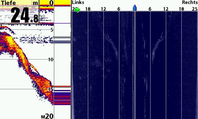 Unten rechts die Sidescan - Ansicht. Man erkennt das ich quasi mittig über