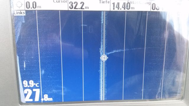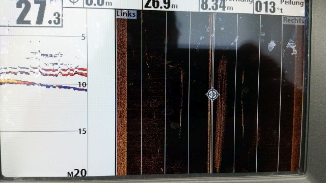Hallo Uli Meine Meinung nach sehr gut. Zander sind leider bei mir letztes Jahr ausgeblieben, aber mit Side Scan konnte ich viele Hechte bis 1,00m fangen. Ich benutze Side Scan seit August 2015 und will es jetzt schon nicht mehr ohne. Auch was für tolle Aufnahmen ich von alten Brücken usw hatte. Fabelhaft. Das hätte ich mit keinen normaler 2D Ansicht gesehen. Meiner Erfahrung nach und vom vielen Lesen über Humminbird Echolote, hat man bei 200 khz, bei 21,0m tiefe, ca 1/3 Durchmesser am Grund. Also ca 7,0m. Zum Boot hin wird der Sendekegel immer schmaler und man hat bei ca 10,0 m tiefe nur noch ca. 3,5 - 4,0m Durchmesser. Das heißt, vom Geber aus ca 1,75 - 2,00m zu jeder Seite. Bei 83 khz hat man bei 21,0m tiefe auch ca 21,0m Durchmesser. Auch zum Boot hin wird dieser Sendekegel schmaler. Bei ca.10,0m hat man dann ca. 10,0 m Durchmesser, was ca.5,0m zu jeder Seite vom Geber macht. Bei diesen 200khz und 83khz natürlich auch nach vorne und hinten vom Geber. Also auch bei 83khz bei 10,0m tiefe, ist es wirklich Glück, wenn man bei der großen Fläche vom Möhnesee eine große Sichel drauf bekommt. Man bekommt sie mit beiden Sendekegel drauf, aber auf jeden Fall seltener als mit Side Scan. Mit Side Scan kann ich mühelos nach links und recht schauen, was ich als Ausschnitt eingegeben habe. Aber nur nach links und rechts. Ich habe in der Regel bis zu 30,0m zu jeder Seite eingestellt. Wenn viel Fisch zu sehen ist, schalte ich auch auf 20,0m. Im Flachwasser bis zu 5,0m schalte ich auch 40,0 - 50,0m. Man sieht dann, was rechts und links los ist ohne das ich mit dem Boot eine Scheuchwirkung habe. Wenn ich über Side Scan einen großen Fisch gefunden habe, drehe ich mit dem Boot zufort in die Richtung und probiere den Fisch ind das normale 2D Fenster zu bekommen. Gelingt nicht immer, weil der Fisch ja auch weiter schwimmt oder man nicht genau in die richtige Richtung gefahren ist. Am ersten Bild sieht man den Fisch am normalen 2D Fenster verschwinden und man sieht ihn auch am Side Scan. In diesen Fall war der Fisch gerade unterm Boot. Am zweiten Bild sieht man den Fisch am Side Scan ca. 25,0 - 30,0m links vom Boot. Ich habe ihn zu spät am Side Scan gesehen und habe ihn beim ansteuern auch nicht mehr wieder gefunden. An alle, die Side Scan am Echolot haben, probiert es aus. Ihr werdet erstaunt sein, was man alles seitlich vom Boot sieht, was das 2D Echo nicht anzeigt. Und nicht nur einmal ausprobieren. Ihr könnt das 2D Fenster und das Side Scan Fenster neben einander laufen lassen wie auf meinen ersten Bild. P.S: Seht Euch auch meine Echolotbilder hier im Forum an. Da sieht man wunderbare Sachen. Gruß Mike