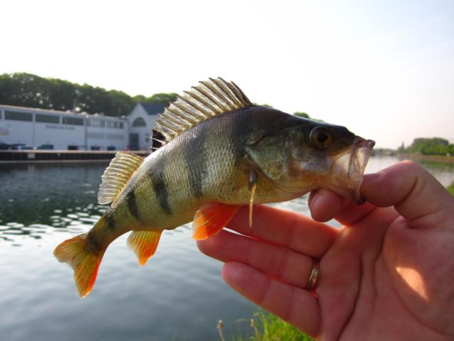 Es war schön klühl eine leichte Ostbrise wehte über den DEK. Nach dem zweiten Wurf hatte ich schon zwei Barsche, vielleicht 10cm