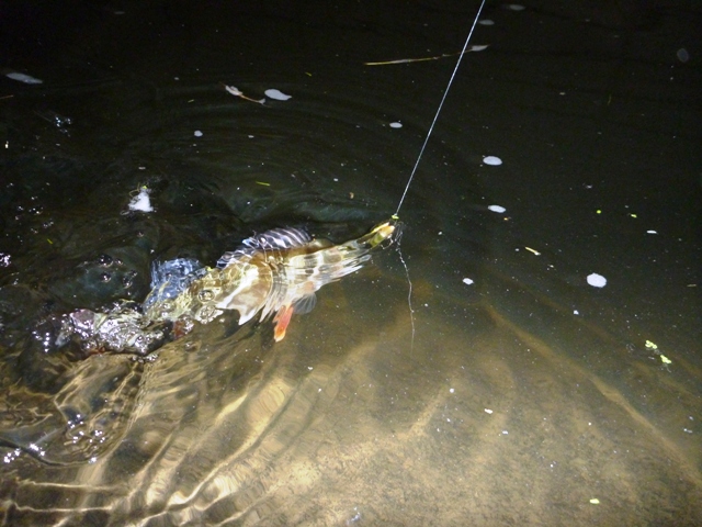 Da es noch nicht sehr hell war, montierte ich mal wieder den quietsch-gelben Gummi-Kopyto. Der Erste Wurf musste weit raus, denn morgens gibt es immer ganz gute Fische auf einem Unterwasser-Plateau. Der Köder setze auf Wasser auf und an strammer Schnur sank der Köder zu Boden. Noch nicht ganz unten – Biss! Die Rute schnellt wie Apollo 13 in Richtung Himmel – HÄNGT! Nach kurzen Drill konnte der Erste schöne Stachelritter des Tages ans Licht kommen. 30cm – Sehr schön!
