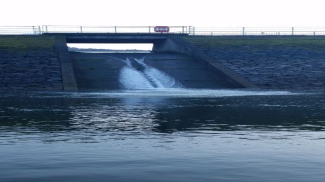 Bilder vom Wassereinlauf im Damm und sein weiterer Verlauf im Wasser. Auf dem Echolotbild das helle, sind die Wasserverwirbelungen.